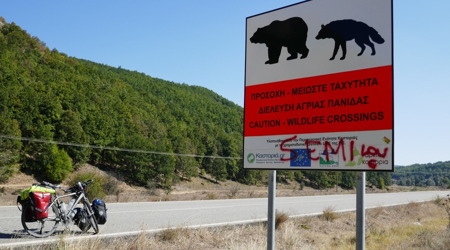 La route nous conduit en Grèce. Nous parcourons nos premiers kilomètres grecs sur une route déserte, quel changement avec l'Albanie où il y a beaucoup de monde sur le bord des routes ou dans les champs et les saluts nombreux. Nous sommes en montagne, les paysages sont plus arides, de nouvelles pancartes font leur apparition, elles indiquent la présence de loup et d'ours, mais c'est comme en France quand on vous annonce la présence de biches ou de chevreuils, on ne les voit jamais, ici c'est pareil.