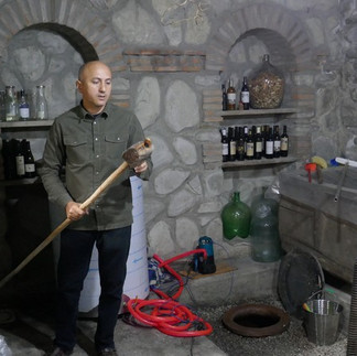 ...et une cave familiale car ici nous sommes dans une région viticole. Le vin est une vieille histoire en Géorgie et surtout dans cette région de Kakhétie où nous sommes. La Géorgie en produit depuis 8000 ans bien avant que les Romains ne répandent la culture du vin sur le pourtour méditerranéen. La technique ancestrale est à nouveau utilisée, elle avait été remplacée par une production industrielle pendant l'ère soviétique qui voulait une production de masse à destination de l'URSS. Cette technique ancestrale donne de très bons vins qui sont surprenants pour nous. Pas de cuves en bois mais des jarres (Kveris) de 300 à 500 litres en terre enfoncées dans le sol. Les grappes entière de raisins sont mises à fermenter pendant plusieurs mois puis le jus est soutiré dans de nouvelles jarres et mis en bouteilles. Cette technique permet de produire des vins naturels sans additifs ni autres produits. Cela donne des vins blancs ambrés.